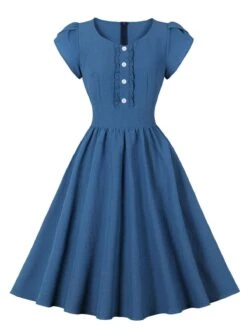 1950s Short Sleeve Ruffles Buttoned Solid Dress